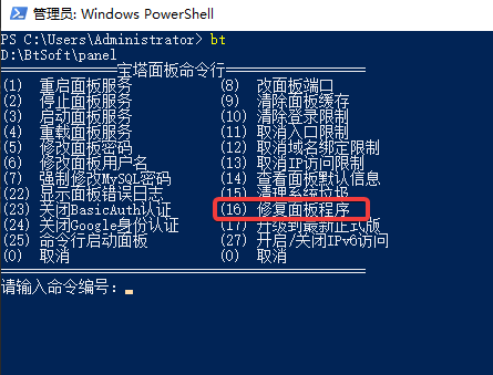 上面步骤执行完后,打开cmd命令或者PowerShell,输入bt 选择修复面板程序