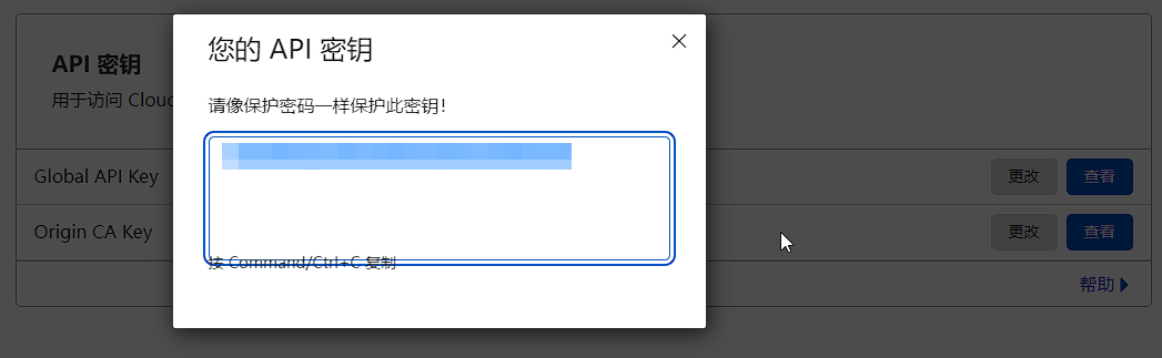 上面API复制好后打开账户信息页面,点击 API Tokens 分类,然后点击 Global API Key 后面的 View,获取 Global API Key